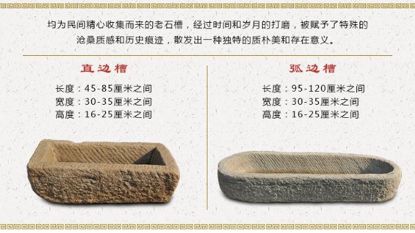 均为民间收集而来的老石槽,经过时间和岁月的打磨,被赋予了特殊的沧桑质感和岁月痕迹。散发出一种独特的质朴美和独特意义。