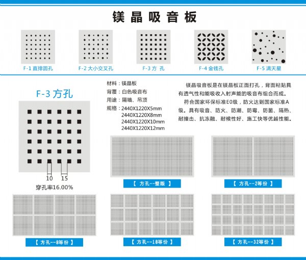 镁晶吸音板是在镁晶板正面打孔,背面粘贴具有透气性和能吸收入射声能的吸音布组合而成。