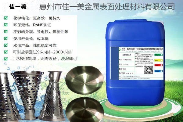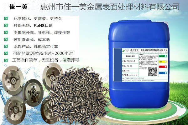 缓蚀剂以及少量高份子钝化促进剂化合而成,不含酸蚀成分,无味。通过本品钝化,可有效保证钝化过程中不会破坏工件原色泽,不改变工件尺寸,并提高不锈钢工件的抗盐雾能力。如400系列等无镍不锈钢410、420、430、1cr13、2cr13、3r13所有型号的不锈铁材料,用于提高其工件的耐腐蚀能力,处理后的工件不改变原色泽,耐盐雾能力可提高6至100倍,可达中性盐雾试验780H不生锈。由于钝化处理时会在工件表面生成一层致密而不易破坏的钝化膜,广泛应用于