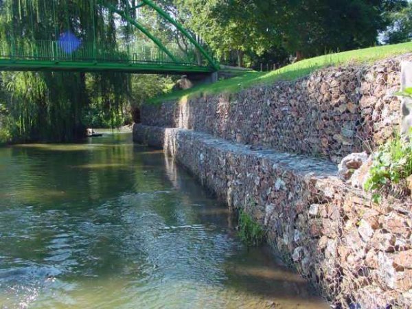 格宾石笼(双绞格网,五绞格网)可制作成网箱、垫、网卷等定型产品,其钢性、柔性、透水性、环保绿化、防止工程病虫害之功效,适应于长期性工程的建设。河道生态治理工程已广泛采用格宾石笼产品,并已取得良好的工程效益和生态建设效果。