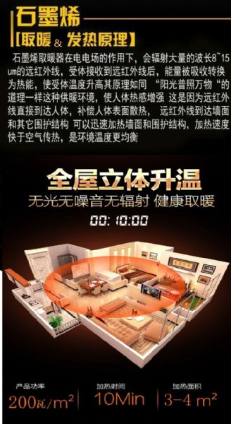 石墨烯是几年前被英国两位科学家发现的一种蜂巢片状六边形纳米碳原子材料,获得2010年诺贝尔物理学奖。ta非常的轻薄而且非常强韧,并且石墨烯有很好的光学力学电学特性,被学术界称为“黑金”,是非常好的一种导热体,电热转换率大于99.8%,是市场上电热转换率Z高的产品 ,(原理是碳原子在电场作用下激烈碰撞运动产生热能,并释放对人体有益的远红外线,无电流无触电危险)用它做的这款发热墙