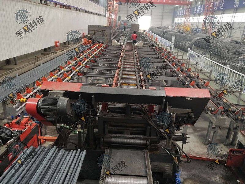 上料机配合使用,上一个来回尚未结束时即可进行下一步配料,节省来回周期;全自动送料辊道,避免原料的二次搬运;钢筋输送、翻转、传递等由机械完成;钢筋输送滚采用 V 型耐磨辊进行,具有耐磨、减噪音、寿命长等特点;滚丝主机头实现了自动夹紧、送进、滚丝。