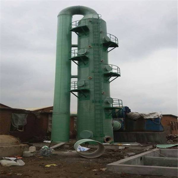 玻璃钢筒体,主体结构有进气室、缓冲段、均气板、喷淋布水段、脱水除雾段六部分组成,设备运转动力为风机引风或送风方式。