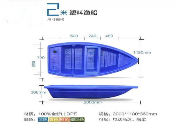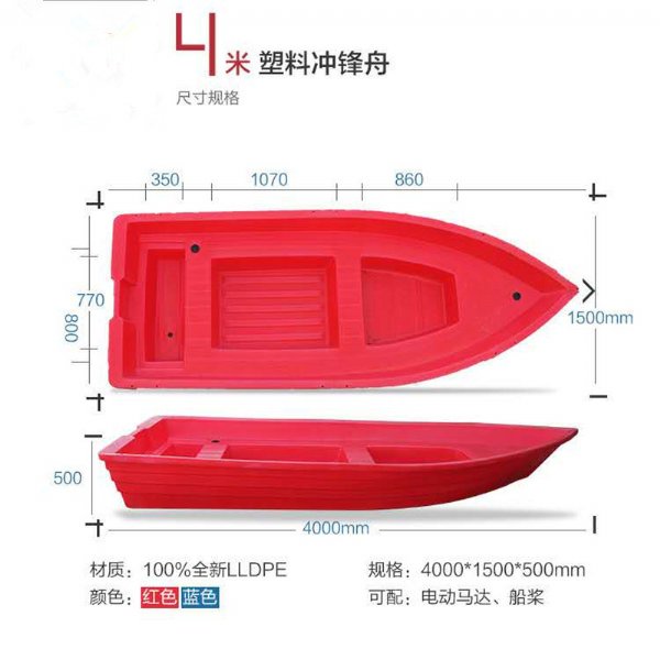 【材质】:塑料船采用进口韩国LLDPE材质,采用国外先进的滚塑工艺整体加工制成,一次成型,无缝焊接。