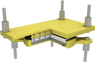钢板及底盆亦相应地改成球面,减小了摩擦系数。其位移由上支座板与平面四氟板之间的滑动来实现。在上支座板上设置导向槽或导向环来约束支座的单向或多向位移,可以制成球形单向活动支座和固定支座。通过球形板和球面四氟板之间的滑动来满足支座转角的需要。