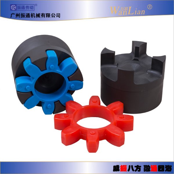 是将一个整体的星型弹性体装在两个形状相同的半联轴器的凸爪之间,以实现两个联轴器的联结。通过凸爪与弹性元件之间的挤压传递动力,通过弹性元件的弹性变形补偿两轴相对偏移,以实现减振缓冲。
