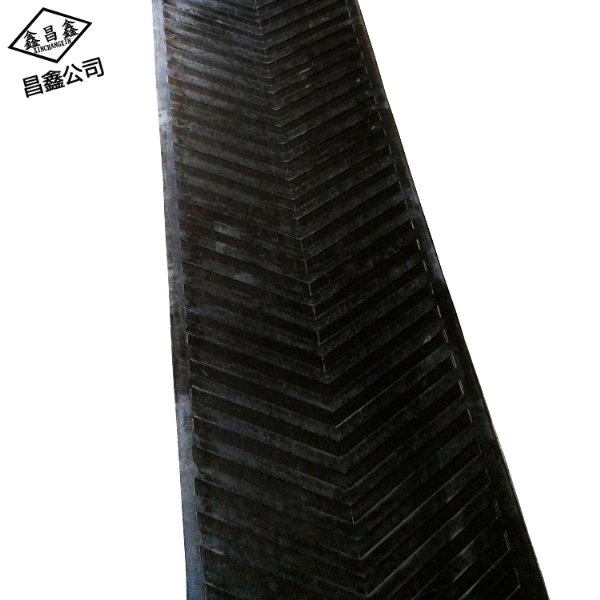 输送带是由工作面为花纹状的覆盖胶和非工作面为平面的覆盖胶与带芯构成的倾角输送带。带面上有高于带体的“人”字型花纹,花纹可是开口也可是封闭的,每一种花纹又可分为高、中、低三种。