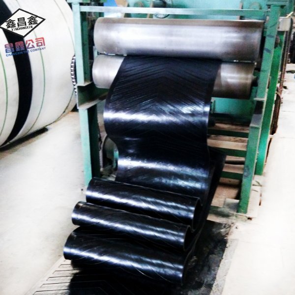花纹输送带是由工作面为花纹状的覆盖胶和非工作面为平面的覆盖胶与带芯构成的倾角输送带。