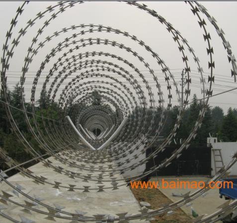不锈钢薄板做刀片,高张力钢丝做芯线组合而成的阻绝器材。由于刺网造形独特不易触摸,因而能达到很好的防护隔离效果。刀刺网按照安装方法不同可分为:蛇腹式