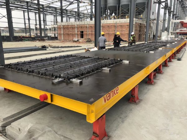 从启动到混凝土预制件的起吊,流水线模台在流水线上流转于不同的工作站,先后完成清扫、划线、预埋、喷油、配筋、浇筑、养护等工序。