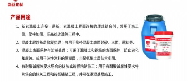 1、新老混凝土连接:是新、老混凝土界面连接的理想结合剂,常用于施工缝、梁柱加固、旧基础改造等工程中。