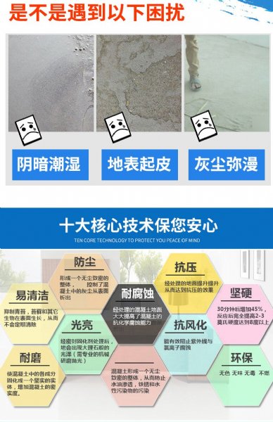 3、基层地面未完全干燥:水份会堵塞水泥地面的毛孔,至致水泥地面起砂处理剂有效成份无法充分渗透,*终影响硬化效果。