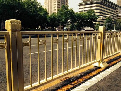 土豪金护栏采用热镀锌静电喷涂护栏,新颖美观,不锈蚀,保证产品,与北京长安街护栏造型类似,十年不生锈十五年免费维护,彩色护栏,样式新颖大方,表面光洁亮丽,灵活简便的组装,广泛用于城市,街道,公园,广场,学校,工厂,河道别墅等,绿化环境。