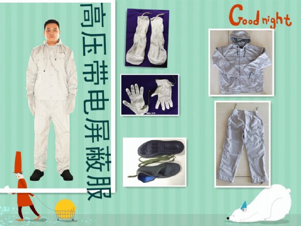 金属丝网,就像罩子一样罩住人。高压不通过人来流动,使处于高压电场中的人外表面各部位形成一个等电位屏蔽面,从而防护人免受高压电场及电磁波的危害。成套的屏蔽服装应包括上衣、裤子、帽子、袜子、手套、鞋及其相应的连接线和连