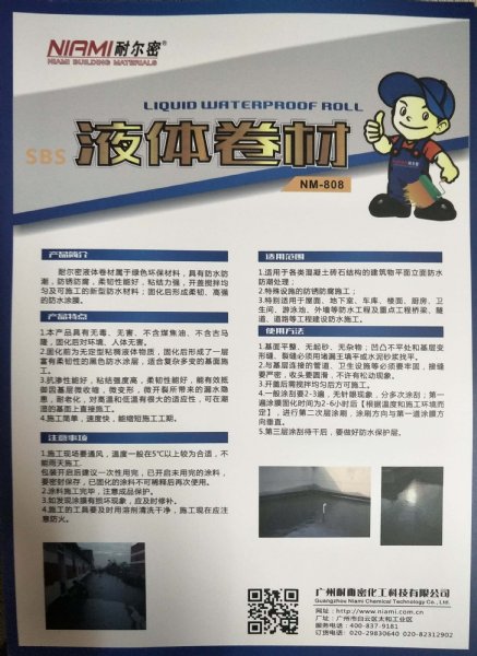 耐尔密液体卷材属于绿色环保材料,具有防水防潮,防锈防腐,柔韧性能好,粘接力强,开盖搅拌均匀及可施工的新型防水涂料;固化后形成柔性、高强的防水涂膜。