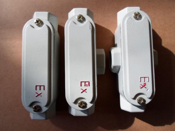 防爆穿线盒从外形上分为:左弯,右弯,三通,直通,四通,后盖底弯通,后盖三通,直角弯通。