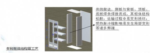 3.柜体采用一体成型、无缝焊技术,极大的加强了柜体的结构性,有效的降低了柜体因热胀冷缩而引起的变形。