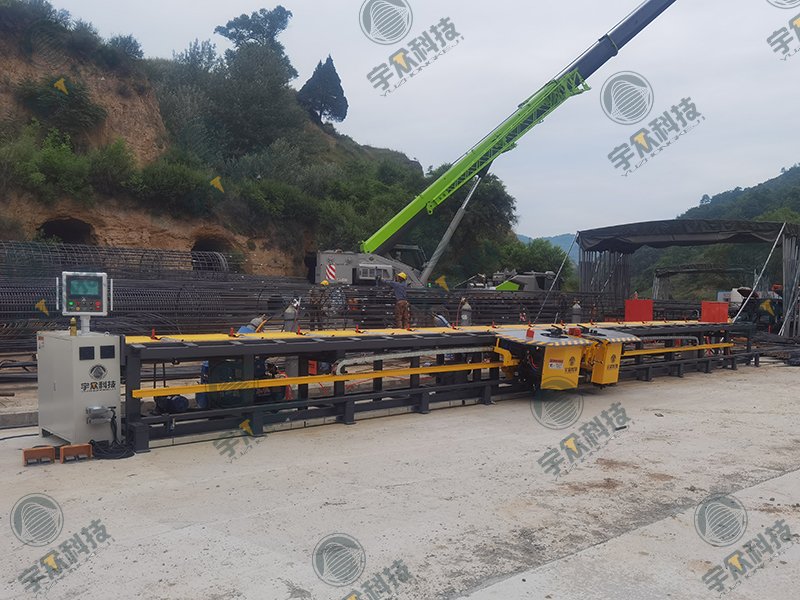 盖梁中棒材钢筋弯曲加工。主要由输送辊道、 托起机构、左弯曲机头、右弯曲机头、夹持器、卸料机构、接料小车、