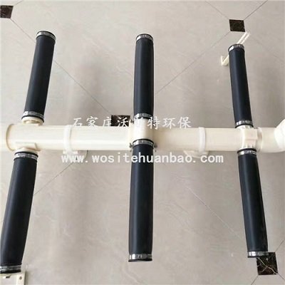 安装膜片(本设备以整套管式曝气器及膜片单独提供),安装膜片时注意部分无孔膜片与地面垂直安装,膜片两端卡箍要拧紧。安装主管可调支架,调平每根曝气主管在同一水平面上。膜片安装完毕,将整套管式曝气器安装与之前已开孔位置;(注意开孔位置应在同一平面上)所有