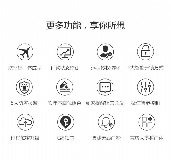 门锁,微信公众号接收门锁消息动态;无需购买网关,WiFi直连直用,连上即可体验智能报警、远程发放访客密码或密钥等智能功能。