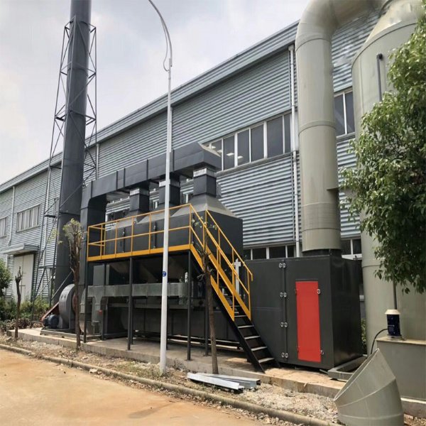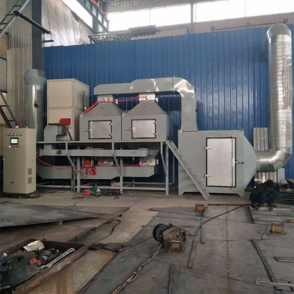 的作用下使废气中的可燃组分彻底氧化分解,从而使气体得到净化处理的一种废气处理方法。催化燃烧废气处理是典型的气-固相催化反应,其实质是活性氧参与深度氧化作用。在催化燃烧过程中,催化剂的作用是降低反应的活化能,同时使反应物分子富集于催化剂表面,以提高反应速率。借助催化剂可使有机废气在较低的起燃温度条件下发生无焰燃烧,并氧化分解为CO2 和H2O,同时放出大量热量。