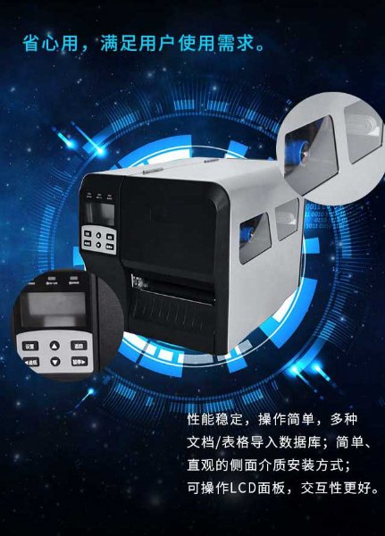 身为工业级标签打印机,它不但性能稳定,操作简单,能实现多种文档、表格导入数据库;简单、直观的侧面介质安装方式;可操作LCD面板,良好的交互性,使用更轻松。商用级的价格,工业级的品质,您值得一试。
