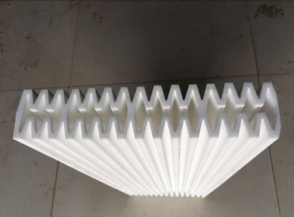 粘合剂严格配比之后进行铸型烧结,形成一个波浪式多孔母体烧结板过滤元件。)呈刚性波浪式多孔结构,塑烧板板厚约4mm,其内部形成大约30μm的均匀孔隙,然后通过特殊的喷涂工艺在母体表面的空隙里填充PTFE涂层,形成 2~3 μм的微孔。