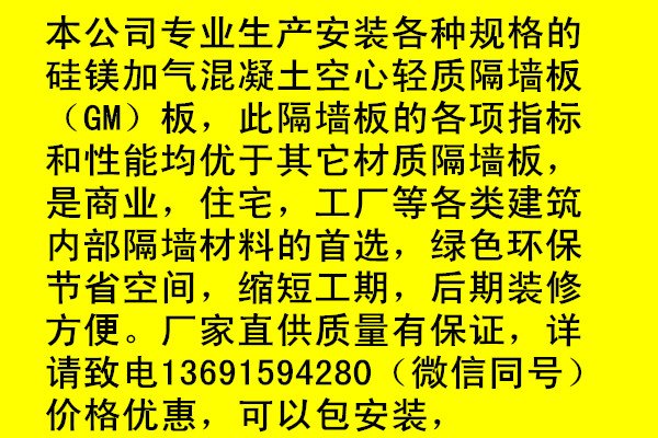 1 轻质:本公司生产的GM板采用多种无机材料及外加剂配合成浆料混合体,然后采用高科技向混合体中导入空气泡,形成无数单独微泡联合体,因此本产品比