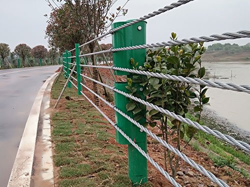 景区缆索护栏分为浸塑B型(普通型),浸塑A型(加强型);热镀锌缆索护栏,是柔性护栏的主要代表形式,它是一种以数根施加初张力的缆索固定于立柱上而组成的结构,它主要依靠缆索的拉应力来抵抗车辆的碰撞,吸收碰撞能量。