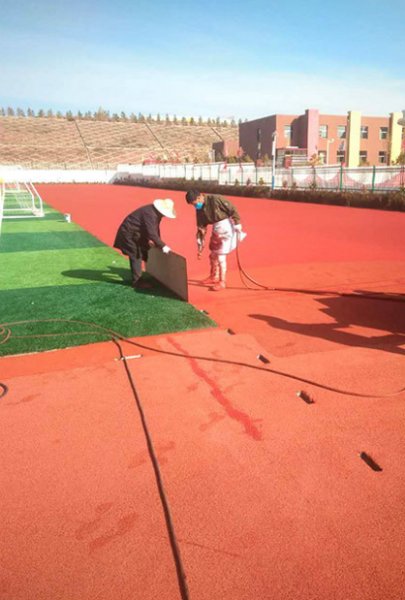 跑道两侧边在粘接过程中,应将存留在跑道底部的空气赶挤干净,为确保侧边粘接牢固应在跑道与跑道侧边,用*工具撬划一下在压稳,这样可以使侧边的粘接接口压住,直至胶水固化。小方格一半填了胶水一半填满空气。运动员在上面竞赛时,空气和原胶受压缩储藏能量和避反震,在脚底离开面层时,天然胶和空气随着扩充把能量反送回给运动员。弯道的铺设与直道铺设流程基本相同,但在操作过程中要更为细心。
