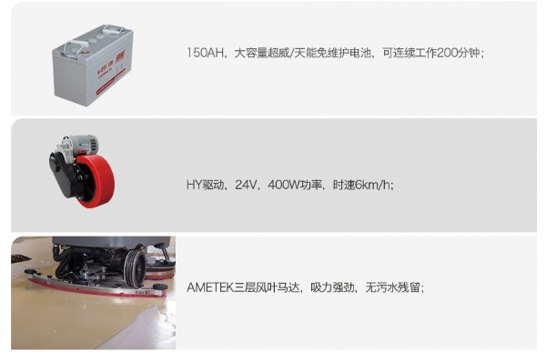 电源供应-行走电机、刷子电机、吸水电机、免维护电瓶;