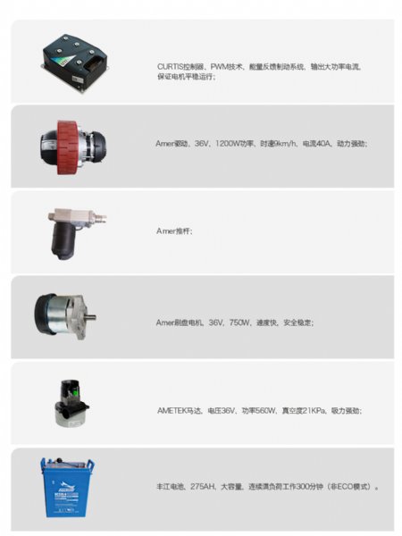电源供应-行走电机、刷子电机、吸水电机、免维护电瓶;2.电气控制-控制器、控制面板。其它部件为易损件,不在质保范围内。