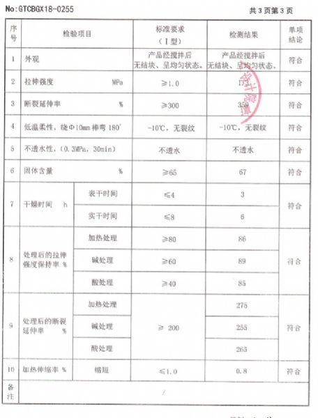 2.拉伸强度大,延伸率高,弹性好,耐高、低温性能好,对基层收缩、开裂、变形的适应性强;