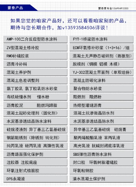 3、 抗渗性能强:MT-2000产品具有良好的抗渗性能,1.7Mpa抗渗压水不透水,符合P16混凝土抗渗性能的要求