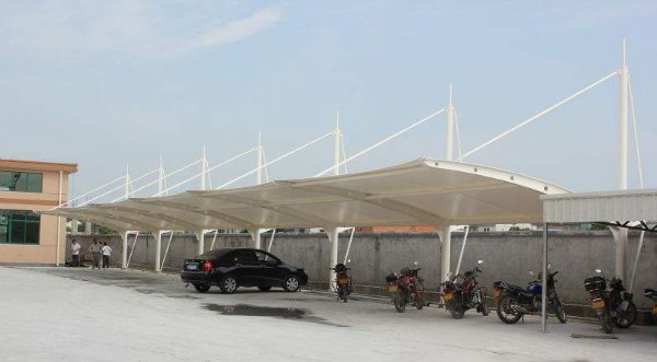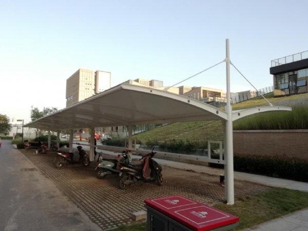 第三点,膜结构停车棚内部采用Φ38镀锌圆管与车棚框架焊接,加强棚顶部强度,可让棚内感觉宽敞明亮,停靠车辆轻松方便,完全符合停车棚制作要求规范;