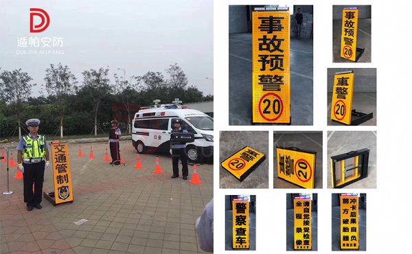 伸缩临检警示牌(公安检查示意牌QM-TCP-A1)具有文字显示、信息发布、可折叠、可升降、警报器警调警示、