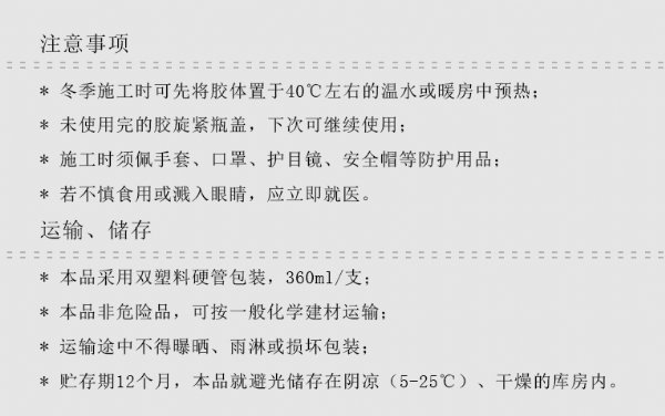 固化:钢筋/螺杆植入后,初凝时间内不可动摇钢筋/螺杆,胶体固化进行一半时可以施工,但不可施加扭矩,胶固化完全后方可检测。