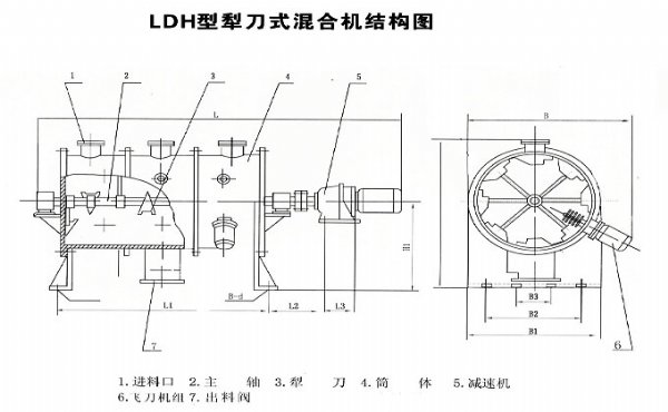 混合机结构如图所示,它主要由传动部分,卧式筒体、犁刀组轴、飞刀组、出料阀、喷液装置等组成。