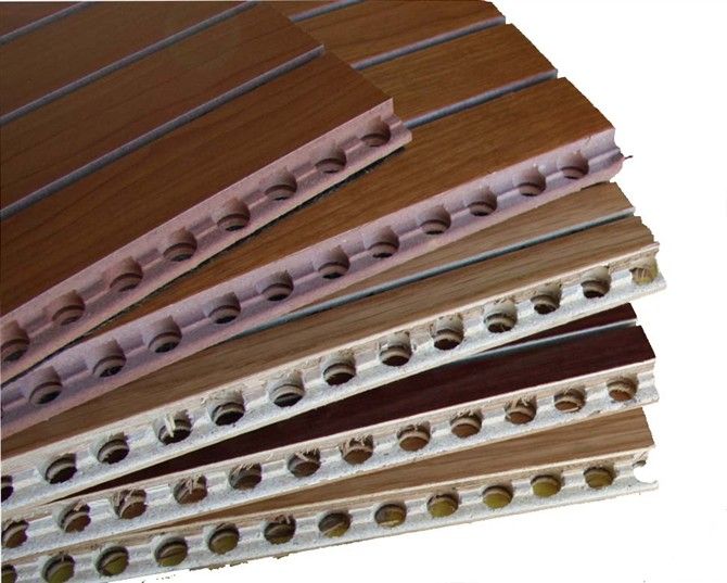 密度板的正面开槽、背面穿孔的狭缝共振吸声材料。常用于墙面或天花装饰。