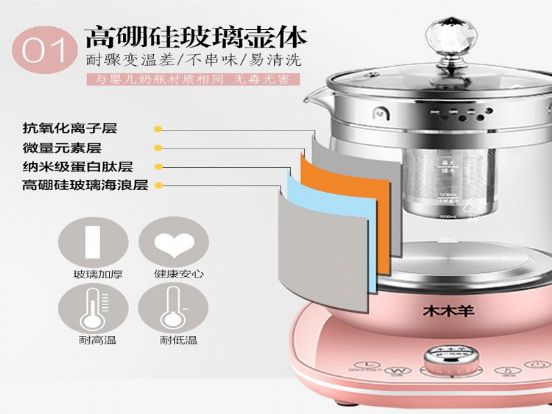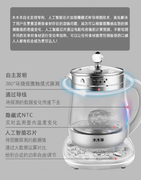木木羊人工智能养生壶与普通养生壶相比 普通养生壶在烹煮过程中会经常存在溢锅问题,从而出现营养浪费与安全隐患,我们的产品有自己研发的“666”双重防溢系统,在不断沸腾的状态下有效解决溢出问题 。