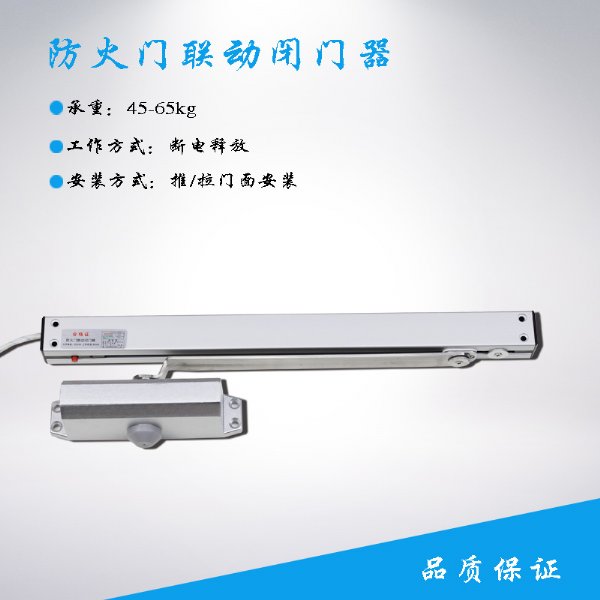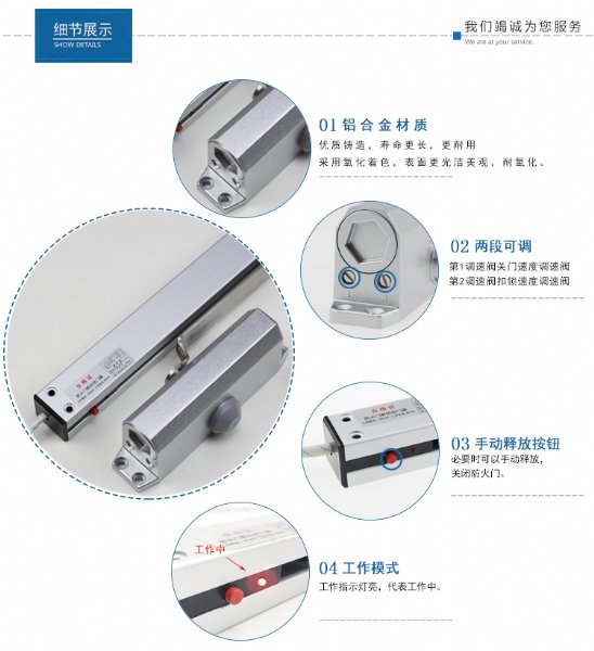 防火门在0-150度保持常开状态,火灾时,接收联动控制信号(断电),自行平稳关闭防火门,并提供反馈信号给控制室。也可手动现场释放关闭防火门。动作后(释放状态),本品完全具有普通闭门器所有功能。手动调为复位状态,进入下一工作循环。