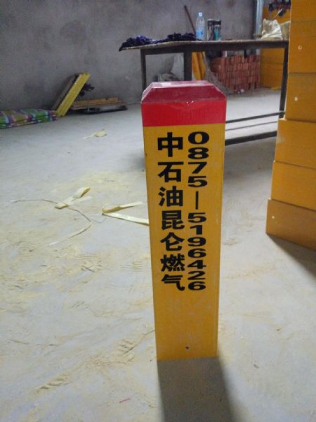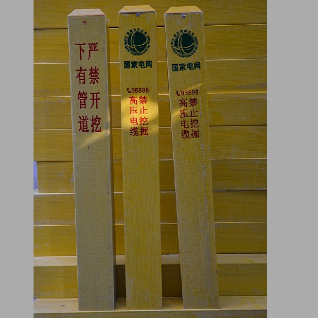 玻璃钢标志桩:经高温压制而成。抗冲击,耐磨损,耐高温,耐腐蚀,可以抗水、汽油、酒精、电解盐、醋酸、盐酸、钠钾化合物、尿、沥青,适合各种酸碱土壤。使用寿命长达30年。内容采用丝网印刷技术,警示效果好,不需要维护。重量轻,便于运输安装。无回收价值,自然防盗。[2]