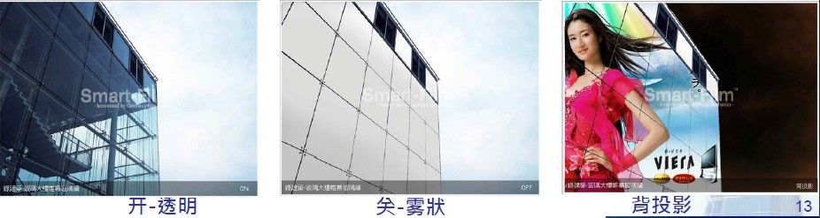 2.调光薄膜(Smart film)之作动-通电时~透明状;不通电时~雾状