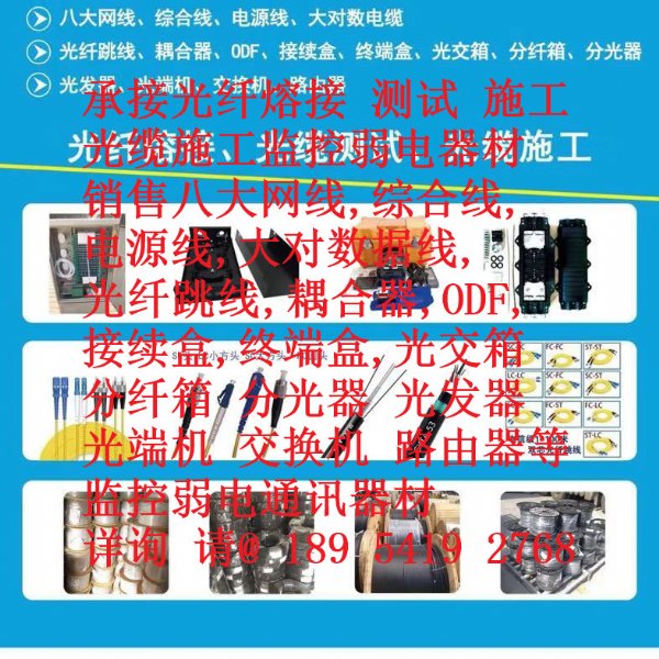 电源线等监控通信线材,以及监控通信弱电工程设计,施工,计算机系统集成及综合布线,智能化工程,弱电工程,消防工程,电力工程, 光纤熔接,光纤抢修,光纤测试,光缆测试抢修施工,监控网络通信网络布线,等弱电工程的施工。光纤通讯产品,光纤配件 ,光发器,