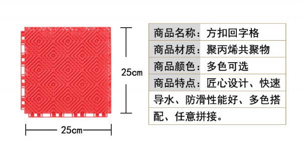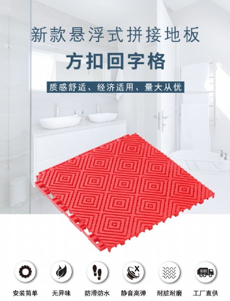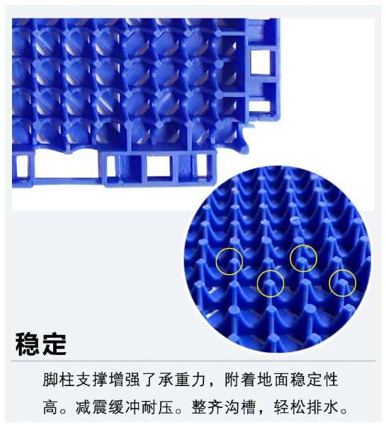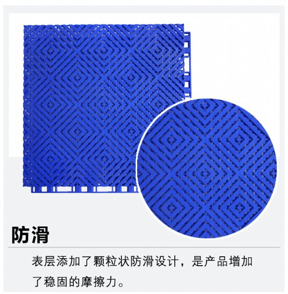 通过密集网孔排列的设计,使水与砂尘能够毫无阻碍的泄漏到地板面层的下面,通过下面支脚之间的空隙而排到场地的外面的