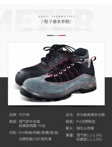 ,毛面牛皮鞋面,双密度PU注塑鞋底,防砸、不防刺穿、防静电、耐磨、耐油。
