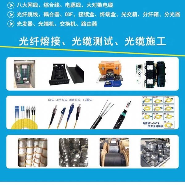 电源线等监控通信线材,以及监控通信弱电工程设计,施工,计算机系统集成及综合布线,智能化工程,弱电工程,消防工程,电力工程, 光纤熔接,光纤抢修,光纤测试,光缆测试抢修施工,监控网络通信网络布线,等弱电工程的施工。光纤通讯产品,光纤配件 ,光发器,