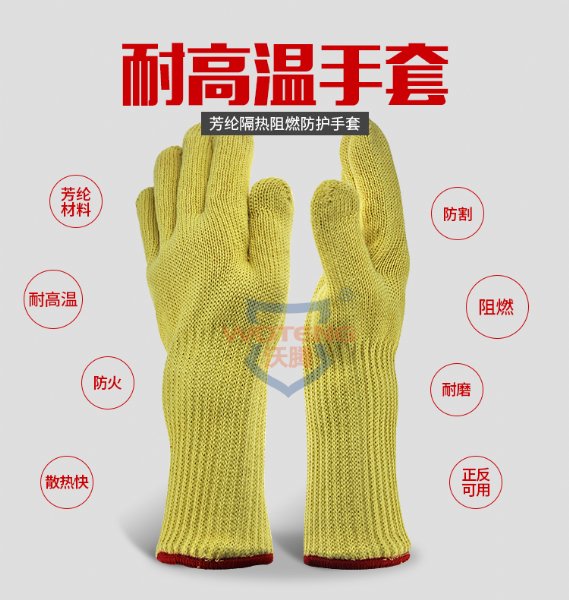 内层涤棉,外层芳纶材料,耐高温的同时又防割防火双层针织而成,手套的厚度相当于“5”个硬币,优良的隔热效果和散热功能.手套可正反面使用,左右手可互换,增长了手套的使用寿命,清洗方便。手套袖口附有2cm的挂绳,使用完后方便收纳,减少占地面积。五指设计,更方便,更灵活。手套佩戴舒适,操作灵活,是您的很好选择。