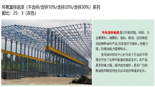 富锌底漆干性快、附着力优、耐冲击性好。漆膜具有阴极保护作用,有着优异的防锈性、耐久性,优良的耐盐雾性、耐油性和耐溶剂性能。