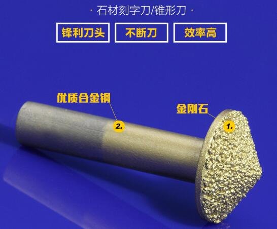花岗岩:G系列专利刻字刀、E系列PCD金刚石刀(刻5公分以下小字)、C系列刻字*刀(刻3公分以上大字,其中3公分字体雕刻效果较粗糙)、 F系列刻字*刀(相对适合刻2D